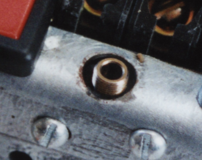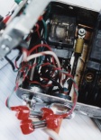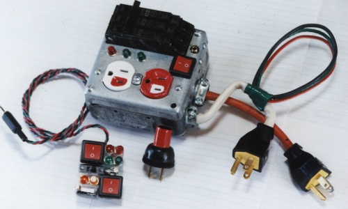 The photo on the right side was intended to show the wiring of the switch and the outlet. All that can be seen is the epoxy strain relief on the back side of the PowerMouse jack. It is added after the wiring to the jack is in place. The red & green object in the center is merely a wire junction made with red and green electrical tape. Behind it is the dummy neon light used for 220 volt applications.