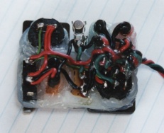 The upper row of photos are of the PowerMouse. It is the hand held control panel for the BoomBox. The photo of the back side shows how it looks before testing. After testing it will have several insulating layers of Goop adhesive as its casing. At this point it is a collection of switches and lights held together by hot melt glue. The photo on the right side shows the clearance of the mini stereo jack that it plugs into. The jack has nuts epoxied to it for mounting. Note the 1/18" gap around the jack. This is to isolate the PowerMouse circuit from the metal box. For some applications the metal box will not be neutral or ground.