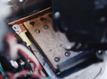The circuit breaker mounting is merely a 1/4" piece of wood with a copper rail at the top and a metal retainer bar at the bottom. The copper rail is a flattened piece of �" copper pipe with a 90 degree bend. It fits into a groove in the wood block and has its connection at the left side. The holes drilled through the wood and the rail are filled with PC-7 epoxy for insulating pins. The retainer bars goes underneath the wood block. The top of the metal box holds the breakers in place as a regular breaker box would.