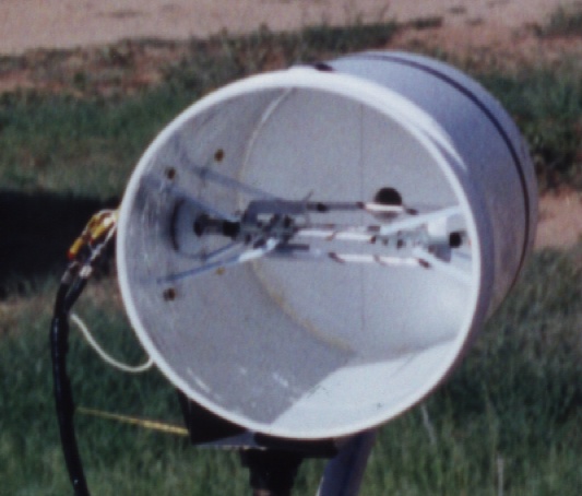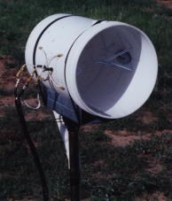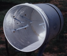 The reflector has a ground plane harness having four branches. To add the intake manifold straws, install the module first. Drill 1/4" holes for straws. Bend flex joint of straw and trim for close fit to fuse glass tube. Apply silicon at straw/bucket area on inside. When dry trim straw of flush on outside. The exhaust tube to the vacuum cleaner is on the back side of bucket. It is 1 1/4 PVC. A threaded fitting is glued to the bucket to allow pivoting.