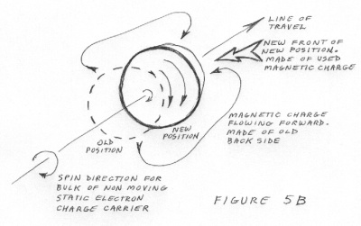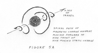 When the electron moves it creates a magnetic corridor for itself. See figure 5. The energy or inertia causing the motion compresses or pushes on the electron. The charge getting pushed on is not a solid but it still cannot pass through itself. Therefore it flows like a stream of water from the point of being pushed upon to the new front of the electron, where it becomes the new front of the new position. The place where it left is now where the back of the electron used to be. The path of this magnetic current is a spiral shape along the line of electron travel. It is a clockwise spiral for electrons as stated by 'The Right Hand Rule'. For protons it would become a counter clockwise spiral. Imagine that the spirals around an electron in motion are of infinant length. The displaced static electrical charge on the back side becomes fluid magnetic charge in motion. That magnetic charge 'current' flows spirally around the electron an infinant number of times to get to its new position on the front of the electron just in time to becomes the static electrical charge on the new front edge as the electron travels.