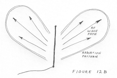 There are two major ways for RF energy to jump off the antenna wire. The most common is the 45 degree lobes of a 1/4 wave antenna. This includes the ring shape of a dipole, which is merely two 1/4 wave antennas back to back. See figure 12c. Once the RF energy has been created at the transmitters final control element, the energy waves have to travel to the antenna. They go in the direction of lower impedances. They cling to the wire and will dissipate energy to the ground or to the opposing phase it if exists. When they get to the antenna they need to have specific values of source impedance to match the antenna and cause lower SWR. To bypass matching troubles the antenna is frequently connected directly to the RF output source if possible.