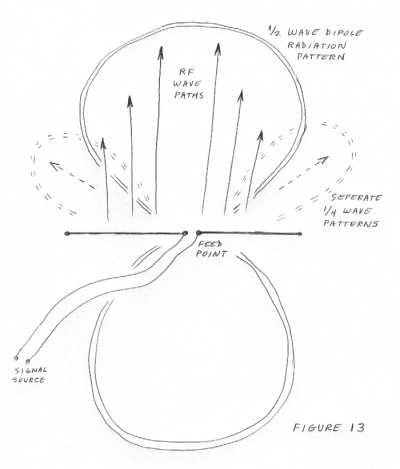 The previous paragraph stated that separate RF radiations do not affect each other. That is true after they leave the antenna element. Just before that happens it is still possible for antenna elements to affect which direction the final RF wave emerges at. A 1/4 wave monopole antenna radiates in a cone shape. See figure 12a. When two of them are placed back to back ( forming a � wave dipole ) the magnetic and electric fields have one last chance to pull on each other. The result is the ring shape of the pattern of the � wave dipole. See figure 13. A similar effect occurs for a long wire antenna. The fields compress against each other and cause a long lobed directional pattern for transmition. The same effect in reverse causes voltage multiplication when used for receiving. See figure 14.