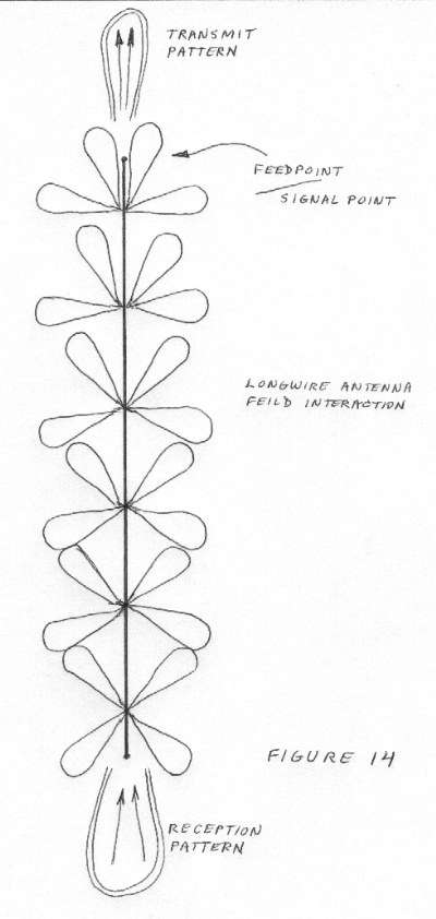 The second major way for RF energy to leave an antenna is on a long wire antenna. When RF energy travels it tends to radiate itself just about everywhere using partial wavelength 'apertures'. It is stopped from radiating by using balanced transmition lines or shielded coax lines. A long wire antenna is many wavelengths long. It radiates in the usual way all along its length. RF energy is emergent all along the wire but its fields compress against each other. That happens because the RF energy is not quite free of the antenna wire when it emerges. The magnetic interaction is caused by the antenna wires magnetic fields. They give shape to the magnetic field of the RF energy which then shapes the RF static charge path. The static charge path is what guides the RF wave to its destination. See figure 14.