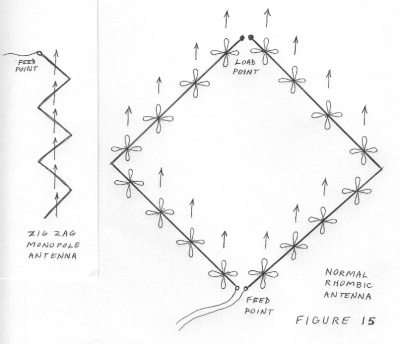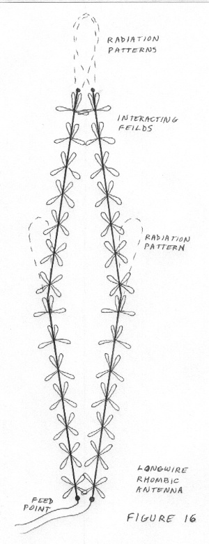 Because RF waves will add together at the target without a problem it is possible to combine many antennas in a very simple way called the Rhombic Antenna. It is a square in shape. Each side of it several wavelengths long. The RF energy that comes out of each wavelength section is radiated at an angle of 45 degrees to the wire. Half of all radiated lobes are in phase and pointed in the same direction. That causes the rhombic antenna to be highly directional. The side lobes cancel each other out. See figure 15. Only the forward RF waves are shown ( as arrows ). The back side radiation is identical. The feed point for transmitting is at the front of the antenna. The signal point for receiving is at the back of the antenna. The antenna is bidirectional as far as front and back go. The terms front and back do apply to a small extent.