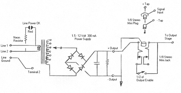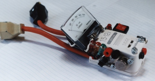 This started out as a simple idea. Glue a few parts to a power supply and wire them together. As construction proceeded more parts got added to the design. Looking back, far more trouble went into getting the parts to fit together than anything else. There just wasn't enough space. The wires are recessed inside grooves cut into the plastic with a mototool.