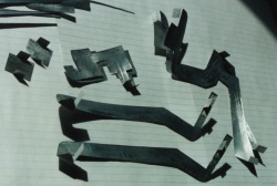 Begin by folding spark gap bases 90 degrees. Produce the holes for the pop rivets. Set